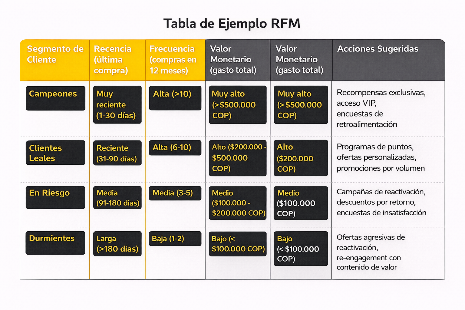 Una herramienta potente para la segmentación es el análisis RFM (Recencia, Frecuencia, Valor Monetario). Este modelo clasifica a los clientes en grupos homogéneos según su comportamiento de compra. Permite identificar a los clientes más valiosos, los en riesgo de abandono y los que son nuevos.