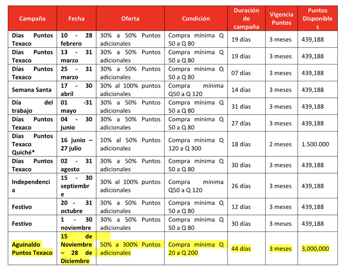 Campaña especial: En el periodo que comprende del 10 de Noviembre al 31 de Diciembre del año 2025, los primeros 70 usuarios nuevos que i. se inscriban por primera vez al programa a través de los canales habilitados, ii. realicen una compra en Combustible Texaco en Estaciones de Servicio participante Las Palmas ( Kilometro 233 Carretera al pacifico aldea Las Palmas), Departamento de Quetzaltenango, y iii. acumulen los puntos de dicha compra, obtendrán 300 Puntos Texaco equivalentes a Q24 que podrán canjear en su próxima compra por Combustible. Es indispensable que el Participante solicite la acumulación de los Puntos, de este modo se identificará su compra. El cargue de puntos se realizará en un periodo de 2 días hábiles a partir de la acumulación de los puntos. Los Puntos Texaco entregados con esta iniciativa, tendrán una vigencia de 60 días calendario una vez de recibido; en caso de no consumirse en este periodo el bono perderá validez.