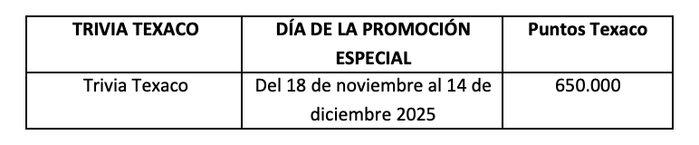 vigencia de cada Promoción Especial Trivia Texaco, todos los Participantes registrados en el programa podrán participar en Trivia Texaco y recibir hasta 200 puntos, siempre y cuando: (i) realicen dos compras cada una igual o superior a veinte dólares americanos (USD$ 20) en Combustible Texaco en las Estaciones de Servicio Texaco participantes en el programa de Puntos Texaco en días diferentes, (ii) acumulen sus Puntos Texaco; es indispensable que el participante solicite la acumulación de los puntos, de este modo el sistema identificará su compra. Aquellos participantes que cumplan con estos parámetros recibirán las indicaciones y los pasos a seguir para participar mediante un correo electrónico de la cuenta info@notificacionesleal.co al correo electrónico con el que se encuentra registrado el Participante en el programa Puntos Texaco. Este correo redireccionará al App Leal donde visualizará la opción para iniciar la Trivia Texaco. El enlace al App Leal tendrá una validez igual a la vigencia de la actividad. Trivia Texaco contará con 3 niveles, cada uno cargado con hasta 25 preguntas. Al iniciar la Trivia Texaco el participante visualizará el nivel activado junto con las vidasdisponibles para participar; cada compra adicional igual o superior a veinte dólares americanos (USD$ 20) le otorgará al participante una vida. El participante contará con 10 segundos para responder las preguntas en cada nivel. Si su respuesta es correcta, esta se visualizará en color verde y pasará a la siguiente; si el participante responde de manera incorrecta, esta se visualizará en color rojo y pasará a la siguiente. En el nivel 1, el participante visualizará 3 preguntas que el sistema arrojará aleatoriamente, de las cuales deberá contestar 2 de ellas correctamente para activar el siguiente nivel y ganar 20 Puntos Texaco. En el nivel 2, el participante visualizará 3 preguntas que el sistema arrojará aleatoriamente, de las cuales deberá contestar 2 de ellas correctamente para activar el siguiente nivel y ganar 50 Puntos Texaco. En el nivel 3, el participante visualizará 3 preguntas que el sistema arrojará aleatoriamente, de las cuales deberá contestar 2 de ellas correctamente para ganar 130 Puntos Texaco. En caso de que el participante conteste las preguntas de manera errónea y no cuente con vidas acumuladas podrá ganar una vida y continuar participando desde el último nivel alcanzado siempre que, durante la vigencia de la Promoción Trivia Texaco I: (i) realice una compra igual o superior a veinte dólares americanos (USD$ 20) en Combustible Texaco en las Estaciones de Servicio Texaco pertenecientes al programa de Puntos Texaco y (ii) acumule sus Puntos Texaco (se obtendrá una vida por cada compra durante la vigencia de la Promoción Especial Trivia Texaco que cumpla con los puntos (i) y (ii) luego de haber activado la Trivia Texaco de la que sea Participante). En caso de que el participante haya agotado la cantidad de preguntas disponible por nivel no podrá seguir participando. A medida que se activan los niveles el grado de dificultad de las preguntas irá incrementando. El participante podrá resultar ganador por una única vez de Trivia Texaco durante el periodo de la dinámica. Los Puntos Texaco ganados en cada nivel serán cargados de manera automática en la cuenta propia con la que se encuentran registrados los participantes en el programa de Puntos Texaco, por ningún motivo los puntos podrán cederse o cargarse a la cuenta de un tercero. Los Puntos entregados tendrán una vigencia de 3 meses una vez acreditados en la cuenta del Participante, en caso de no consumirse en este periodo los Puntos Texaco perderán su validez.